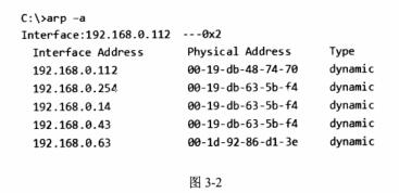 网络运行过程中出现以下现象: (1)随着连接数的增加,该网络逐渐变慢,一段时间后出现用户频繁掉线; (2)计算机重启以后网络无法连接,需要重启接入交换机接口; (3)网络出现丢包严重、掉线的故障,分布在不同的物理区域。 网管员在故障计算机上运行arp-a命令,结果如图3-2所示。