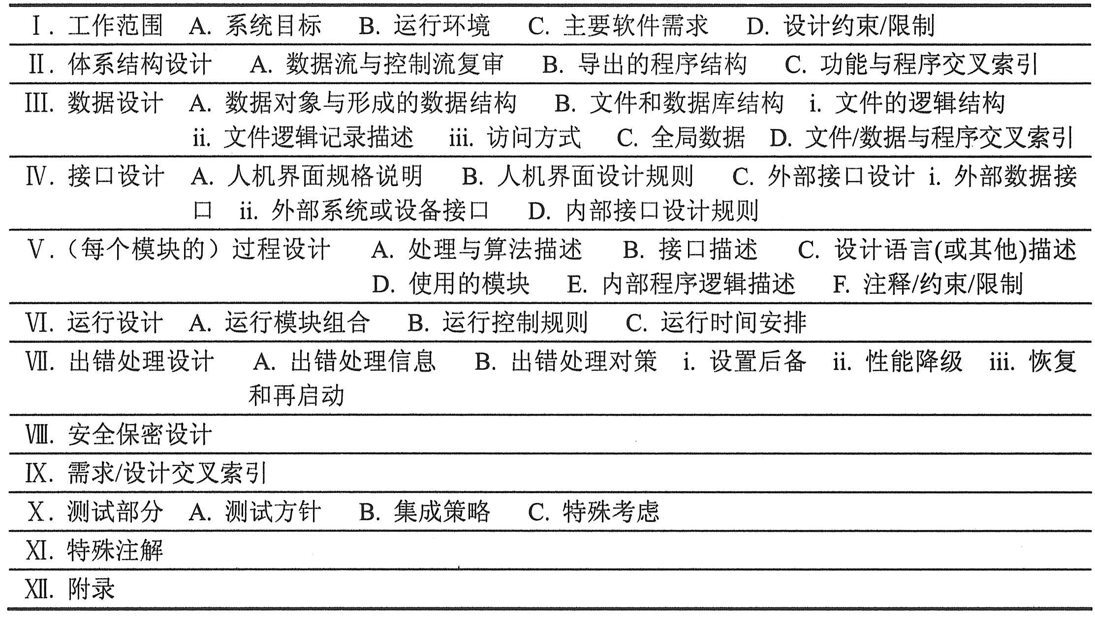 . 设计说明书的框架。如下表所示为软件设计规格说明的大纲。