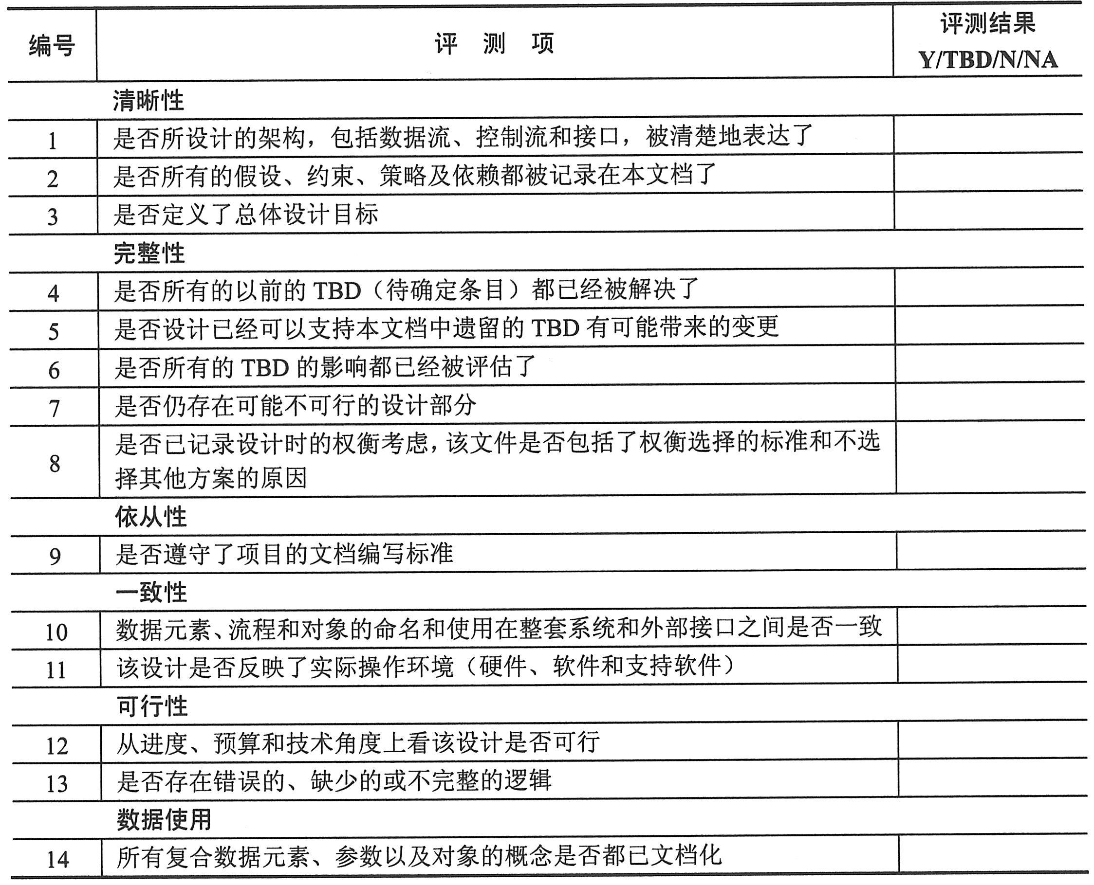 根据上述讨论的评测内容以及评测标准,可以建立概要设计说明书评测规范,如下表所示。