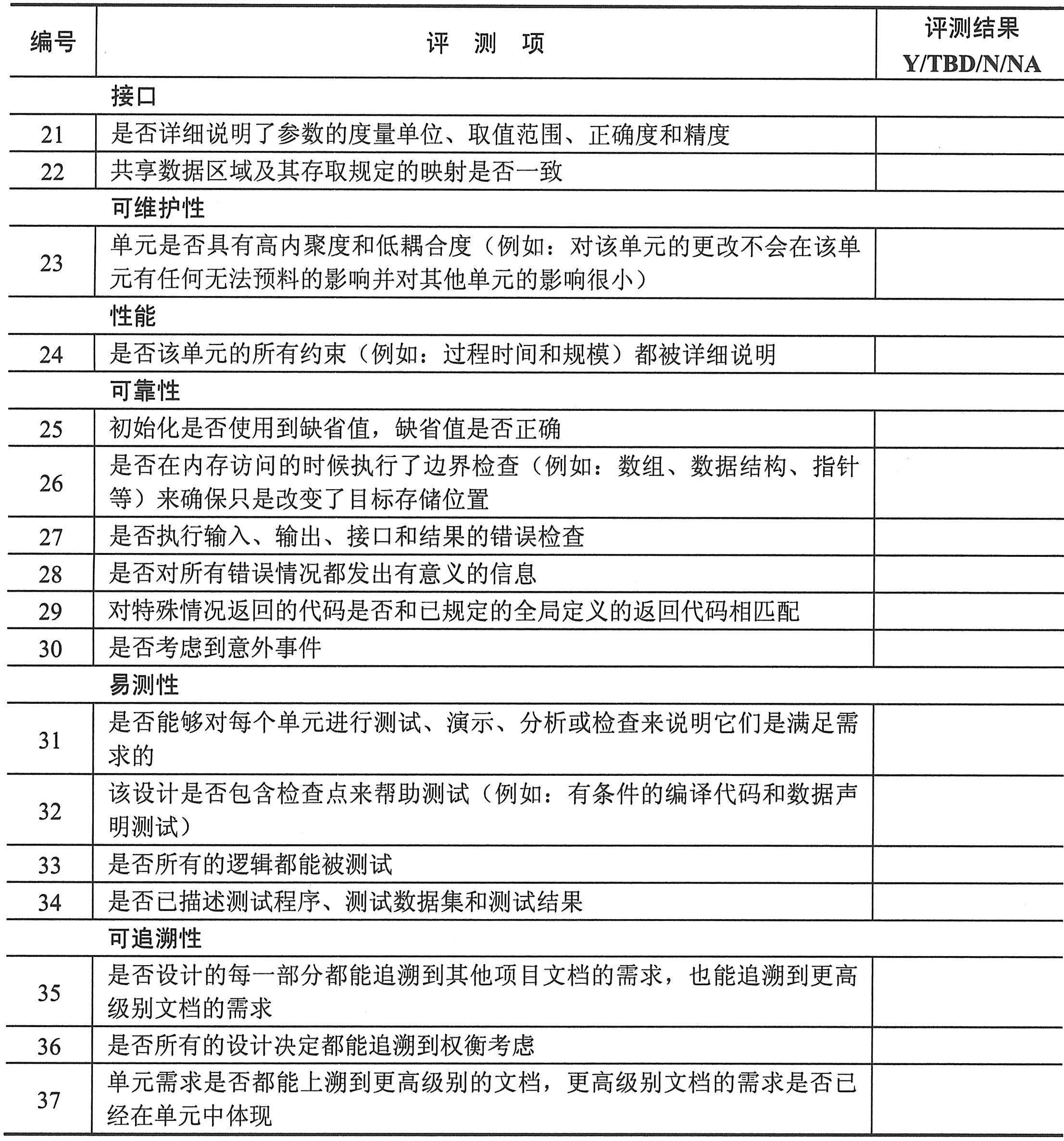 ①可追溯性:即分析该软件的系统结构、子系统结构,确认该软件设计是否覆盖了所有已确定的软件需求,软件每一成份是否可追溯到某一项需求。