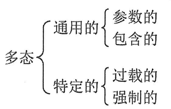 多态有几种不同的形式,Cardelli和Wegner把它分为4类,如下图所示。其中,参数多态和包含多态称为通用的多态,过载多态和强制多态称为特定的多态。