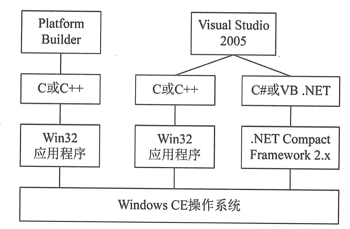 如下图所示,Windows CE应用程序开发工具包括:①Platform Builder;②eMbedded Visual Tools;③eMbedded Visual Basic;④eMbedded Visual C++。它们都是专门针对Windows CE操作系统的开发工具。