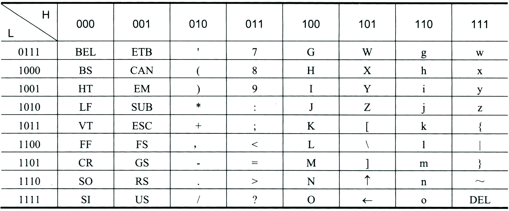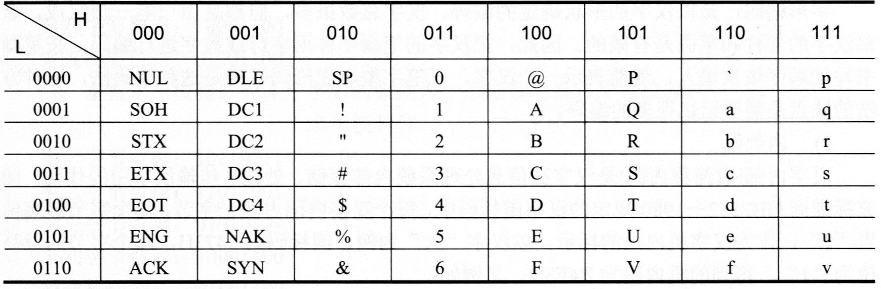 ASCII码采用7个二进制位对字符进行编码,其格式为每1个字符有1个编码。每个字符占用1个字节,用低7位编码,最高位为0。其共有128个编码,编码从0~127,如下表所示,其中H表示高3位,L表示低4位。