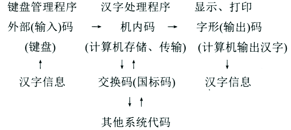 汉字处理包括汉字的编码输入、汉字的存储和汉字的输出等环节。在汉字处理的各阶段,分为输入码、(机)内码、交换码(国标码)和字形码,各种码对应的处理过程如下所示: