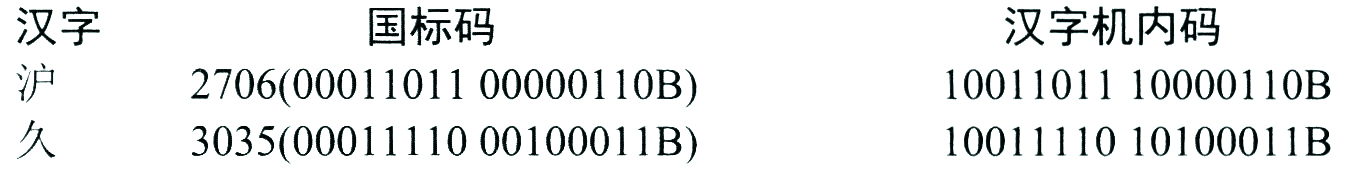 汉字内部码(简称内码)是汉字在信息处理系统内部存储、处理、传输汉字用的代码。国家标准局GB2312—1980规定的汉字国标码中,每个汉字内码占两个字节,每个字节最高位置"1",作为汉字机内码的标示。以汉字"大"为例,国标码为3473H,两个字节的最高位为"1",得到的机内码为B4F3H。又例如: