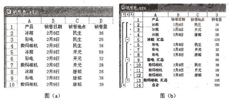 某品牌商品销售情况表如图(a)所示。若想按产品类别分别累计销售量,可使用分类汇总命令。汇总的结果如图(b)所示。