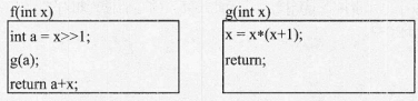 已知函数f().G()的定义如下所示,调用函数f时传递给形参x的值是5。若g(a)采用引用调用(call by reference)方式传递参数,则函数f的返回值为(33);若g(a)采用值调用(call by value)的方式传递参数,则函数f的返回值为(34)。其中,表达式“X>>1”的含义是将x的值右移1位,相当于x=2。