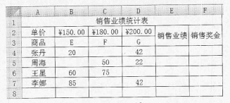 有如下Excel2007工作表,在A8单元格中输入函数”=COUNTA(B4:D7)”,按回车键后,则A8单元格中的值为(50);要计算张丹的销售业绩,应在E4单元格中输入函数(51);销售奖金的计算方法是某种商品销售量大于等于70奖励500元,小于70则没有奖励。要计算王星的销售奖金,应在F6单元格中输入函数(52)。