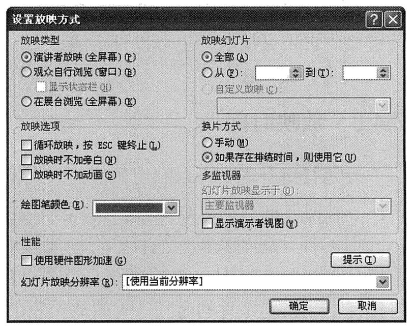 幻灯片放映方式有演讲者放映、观众自行浏览和在展台浏览三种。设置方法。选择“幻灯片放映”→“设置放映方式”命令,系统显示下图所示对话框。