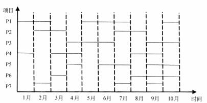某企业明年1〜10月计划实施一个大工程,包括七个项目P1〜P7。各项目的进度计划如下图。按照该计划,到明年(65)该工程应实施了一半,因此安排此时进行中期检査。