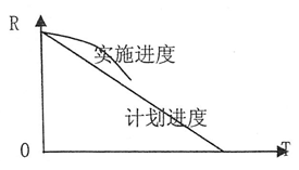 在实施项目过程中,信息处理员小王在“时间T-项目剩余工作量R”平面坐标系上动态地记录了项目实施进度,并与计划进度做了对比。在项目实施中途,从图上可以看出该项目( )