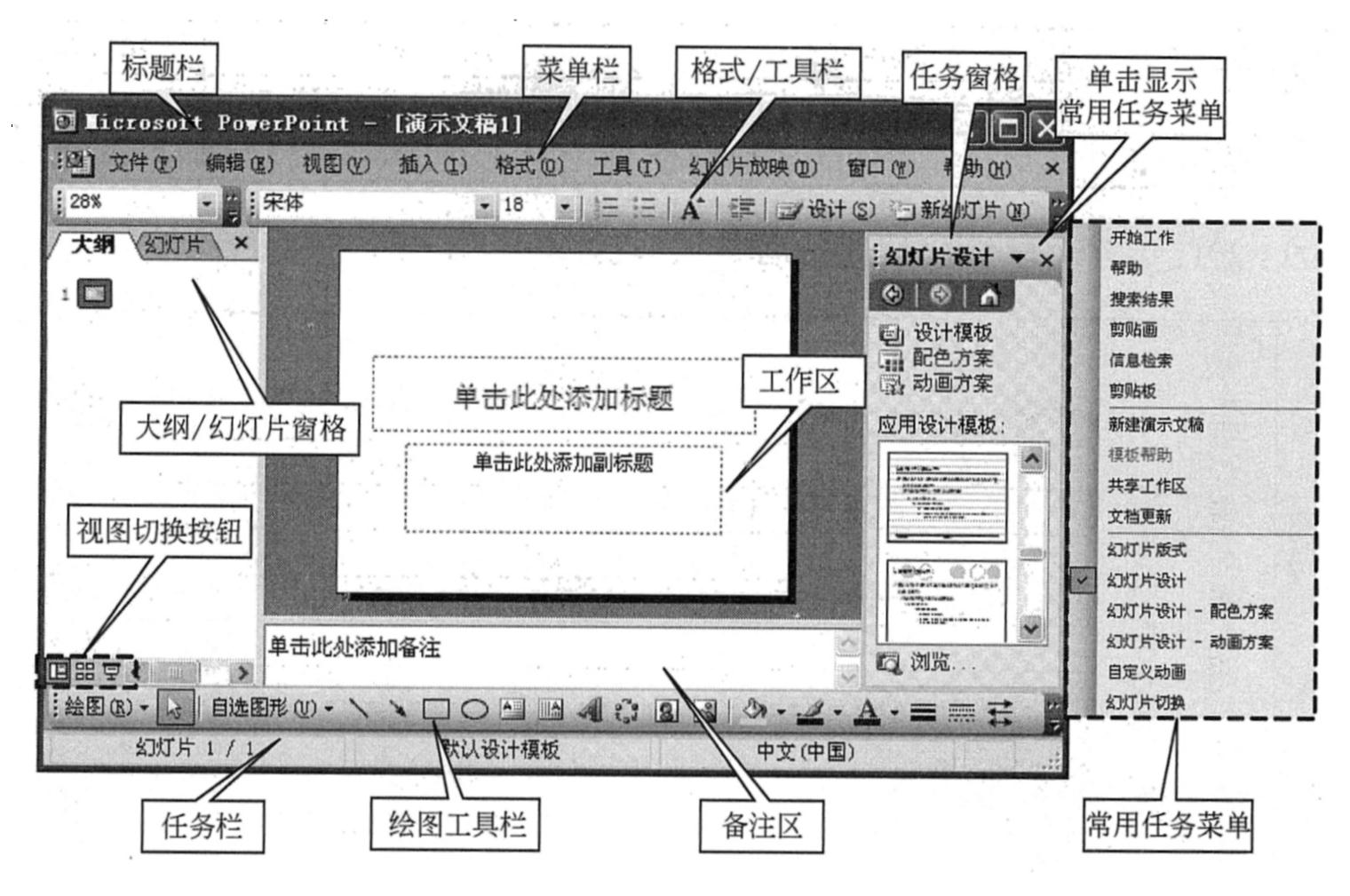 PowerPoint 2003窗口与Word 2003非常相似,如下图所示。