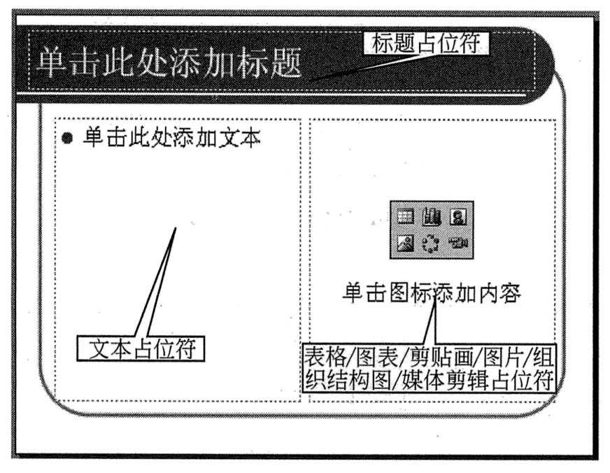 幻灯片版式实际上是幻灯片上各种对象的布局,是一张幻灯片上各种对象(如文本、表格和图表等)的格式和排列形式。在创建幻灯片时,若用户选择一种非空的自动版式,则该幻灯片中会自动给出相应的标题区域、文本区域和其他对象区域,它们分别用一个虚框表示,该虚框被称为占位符,单击占位符可以添加文字,或单击图标添加指定的对象。如下图所示。