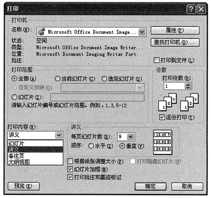 演示文稿可以有幻灯片、讲义、备注页和大纲形式打印输出。具体操作方法:选择“文件”→“打印”命令,在弹出的“打印”对话框中的“打印内容”下拉列表中选择打印方式,如下图所示,单击“确定”按钮。