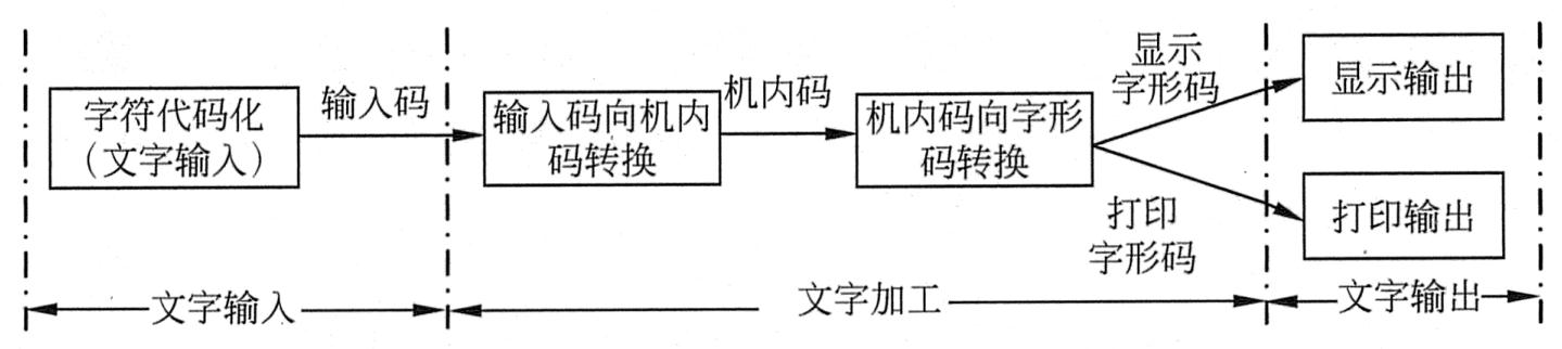 汉字处理包括汉字的输入、汉字的存储和汉字的输出环节。其中,汉字的输入采用输入码,汉字的存储采用机内码,汉字的输出采用字形码。计算机处理汉字首先必须将汉字代码化(即对汉字进行编码),这样,用户可以从键盘上输入代表某个汉字的编码。采用不同的编码系统进行汉字输入的方案称为汉字的输入法,如区位码、五笔字型码、拼音码、智能ABC、微软拼音等输入法。