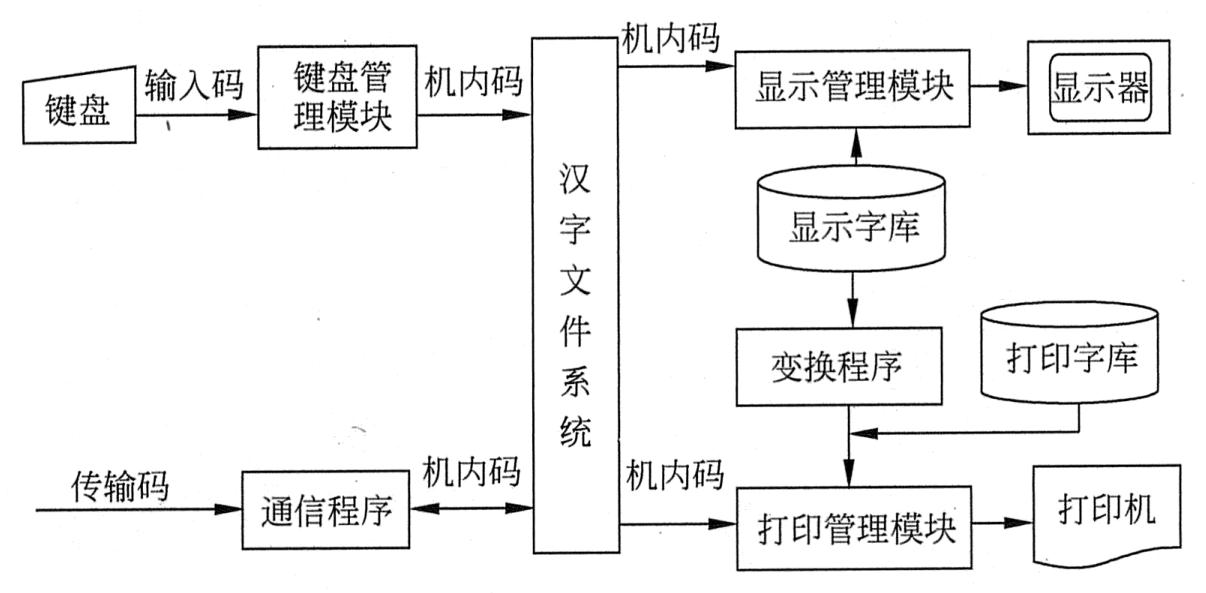 汉字种类繁多,编码比拼音文字困难,而且在一个汉字处理系统中,汉字输入、内部处理、存储和输出的代码是不同的。汉字信息处理系统在处理汉字和词语时,其关键的问题是要进行一系列的汉字代码转换。从上图也不难看出,必须将字符或汉字的输入码转换为机内码,机内码转换为显示字形码或打印字形码。