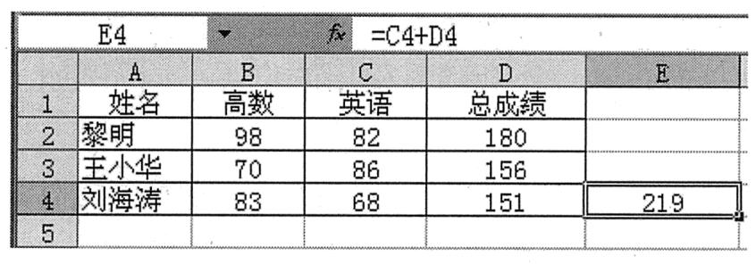 从上例可见,总成绩计算采用相对引用能有效提高工作效率。导致这种结果的根本原因是复制公式的相对地址发生了变化。因为,如果将公式“=A2+B2”复制到E4,则编辑栏中显示公式为“=C4+D4”,E4=219。