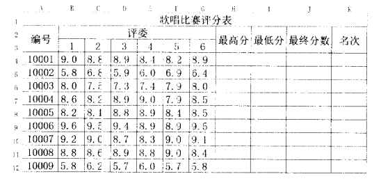 在Excel的Sheet1工作表的A1:K12单元格区域创建“歌唱比赛评分表”(内容如下图所示)。按题目要求完成之后,用Excel的保存功能直接存盘。注意:不在上述单元格范围内的解答不得分。