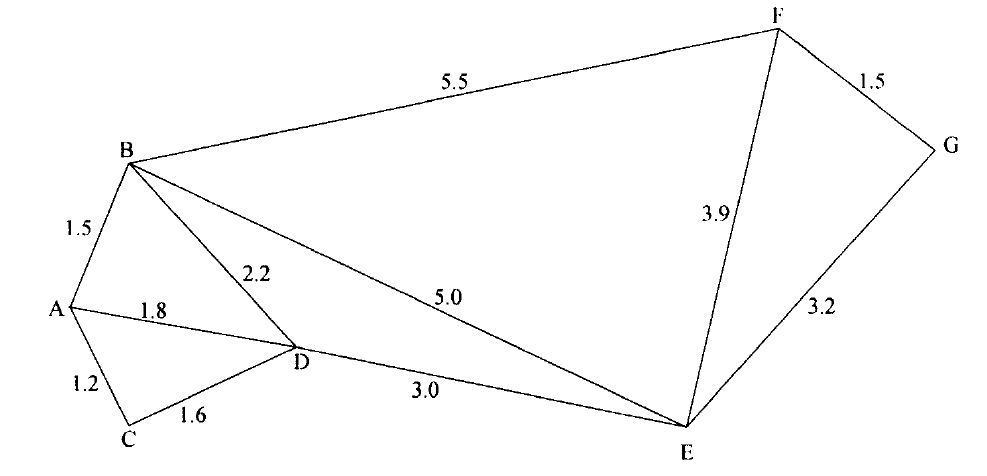 A、B、C、D、E、F、G代表七个村落,村落之间的道路连通情况如下图所示(边上的数据为距离,单位为公里)。 这七个村落拟合建一所小学,已知A村有小学生50人、B村有小学生40人、C村有小学生60人、D村有小学生20人、E村有小学生70人、F 村有小学生80、G村有小学生100人。则拟合建小学应建在(70)村落,才能使学生上学所走的总路程最短