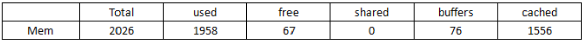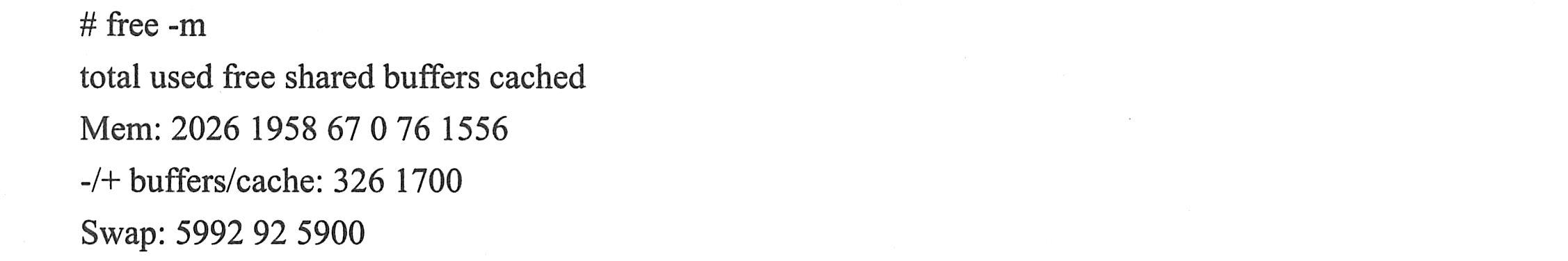 如上所示,2026表示系统总内存、1958表示系统使用的内存、67表示系统剩余内存,当剩余内存低于总内存的10%时视为异常。