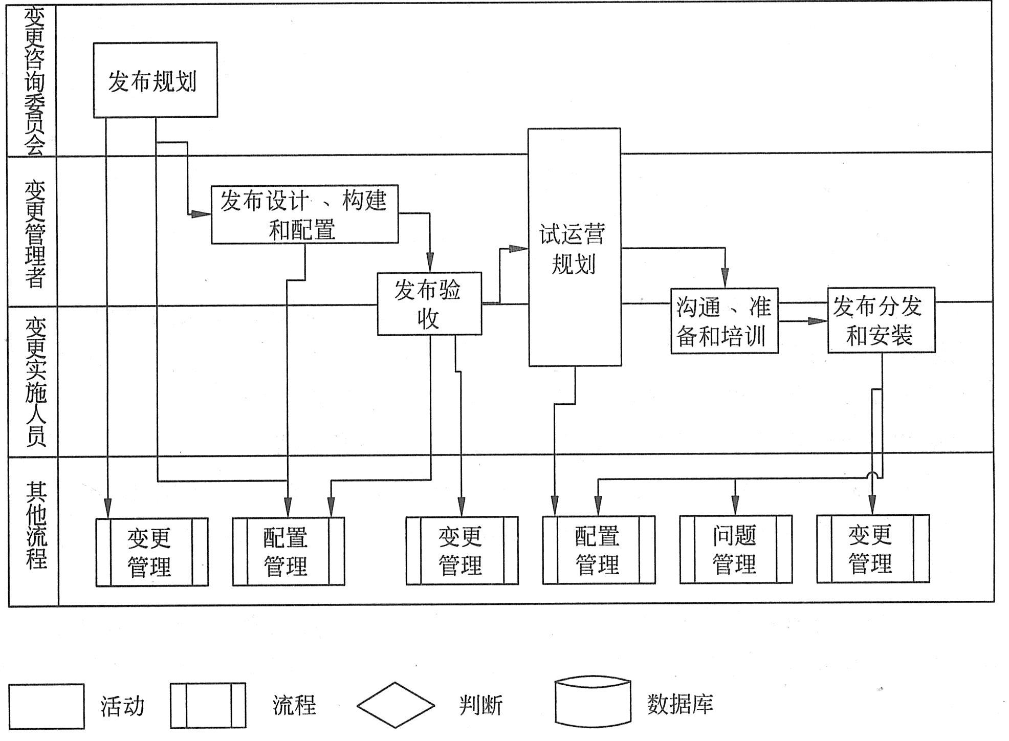 发布管理的流程包括发布规划,发布设计、构建和配置,发布验收,试营运规划,沟通、准备和培训,发布分发和安装等。发布管理基本流程模型如下图所示。