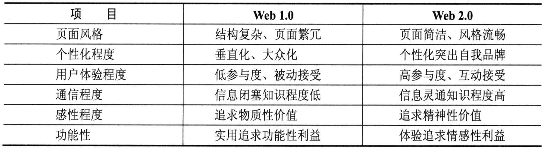 Web 2.0指一个利用Web的平台,由用户主导而生成的内容互联网产品模式,为了区别于传统由网站雇员主导生成的内容而定义为第二代互联网。Web 1.0和Web 2.0的区别如下表所示。