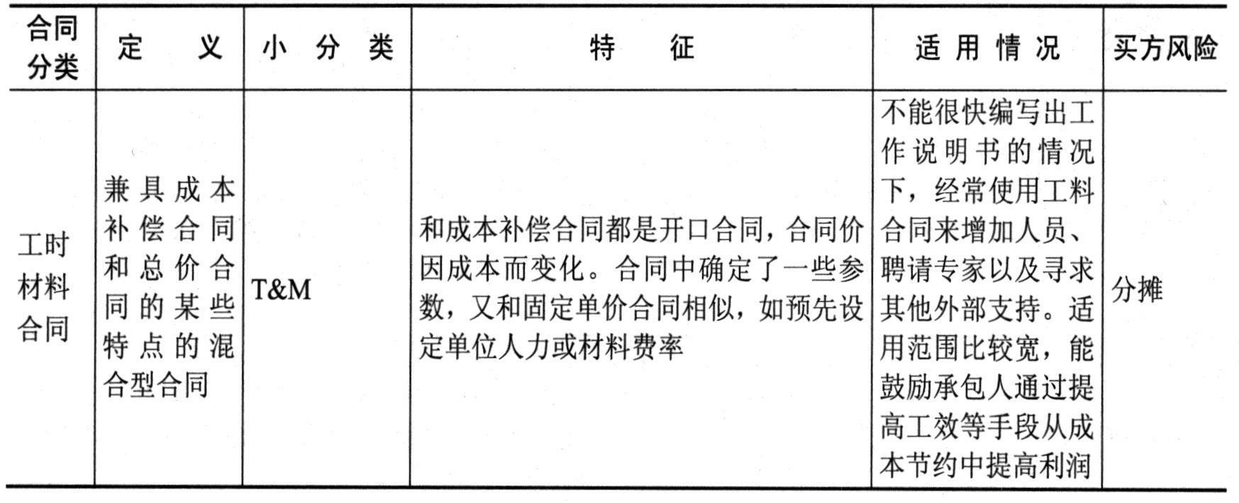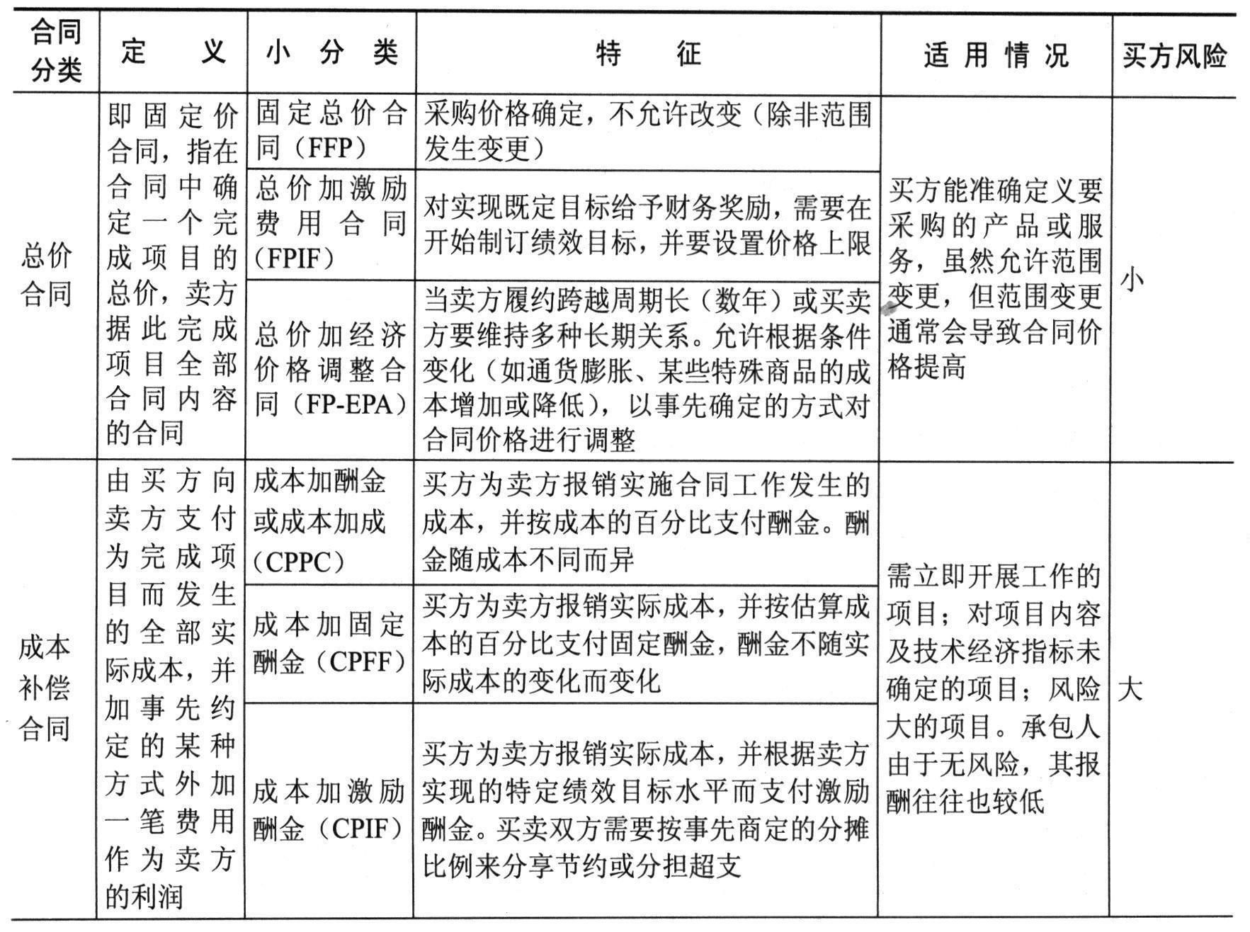 按项目付款方式划分,项目合同一般分为三大类,即总价合同、成本补偿合同和工料合同,每一类下又可分为小类。下表列出了这三种合同的区别及适用情况。