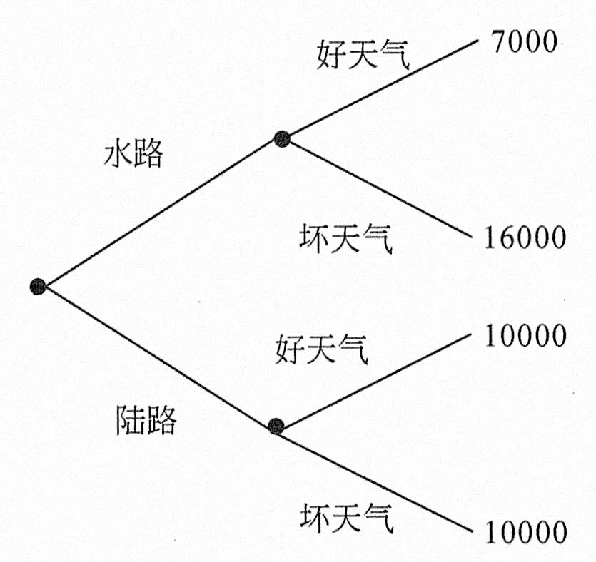 根据本问题的决策树,走水路时,成本为7000元的概率为75%,成本为16 000元的概率为25%,因此走水路的期望成本为(7000×75%)+(16 000×25%)=9250元。走陆路时,其成本确定为10 000元。因此,走水路的期望成本小于走陆路的成本,所以应该选择走水路。