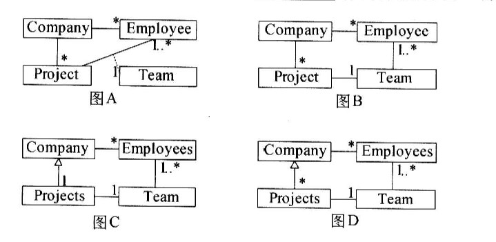 对于场景:一个公司负责多个项目,每个项目(Project)由一个员工(Employee) 团队(Team)来开发。下列UML概念图中,(41)最适合描述这一场景。