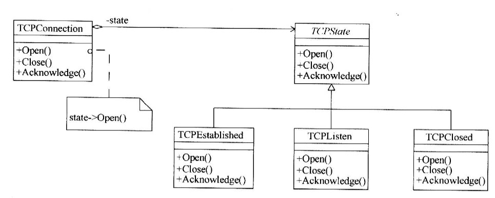 每种设计模式都有特定的意图。(44)模式使得一个对象在其内部状态改变时通过调用另一个类中的方法改变其行为,使这个对象看起来如同修改了它的类。下图是采用该模式的有关TCP连接的结构图实例。该模式的核心思想是引入抽象类(45)来表 示TCP连接的状态,声明不同操作状态的公共接口,其子类实现与特定状态相关的行为。当一个(46)对象收到其他对象的请求时,它根据自身的当前状态做出不同的反应。