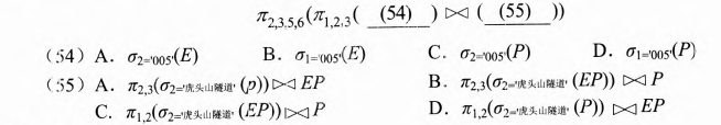 给定员工关系E(员工号,员工名,部门名,电话,家庭住址)、工程关系P(工程号,工程名,前期工程号)、参与关系EP(员工号,工程号,工作量)。查询“005”员工参与了“虎头山隧道”工程的员工名、部门名、工程名、工作量的关系代数表达式如下∶