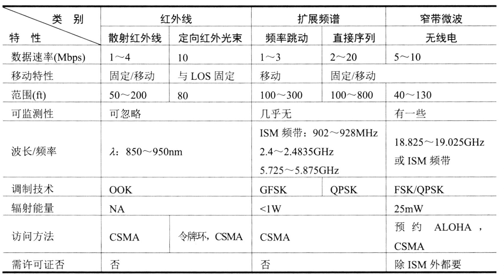 现在无线网主要使用3种通信技术:红外线、扩展频谱和窄带微波技术。这3种技术的主要特点如下表所示。