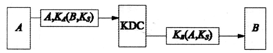 认证过程如下:A向KDC发出消息{A,KA(B,KS)},说明自己要与B通信,并指定了与B会话的密钥KS。注意,这个消息中的一部分(B,KS)是用KA加密的,所以第三者不能了解消息的内容。KDC知道了A的意图后就构造了一个消息{KB(A,KS)}发给B。B用KB解密后就得到了A和KS,然后就可以与A用KS会话了。