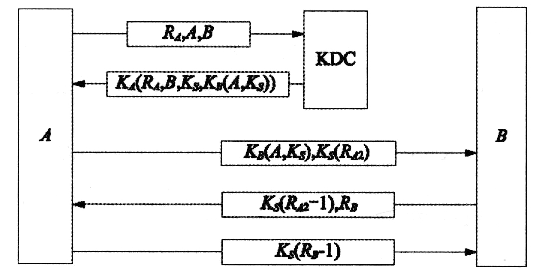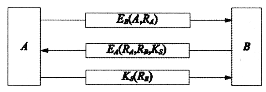 Needham-Schroeder认证协议是一种多次提问—响应协议,可以对付重放攻击,关键是每一个会话回合都有一个新的随机数在起作用。其应答过程如下图所示。