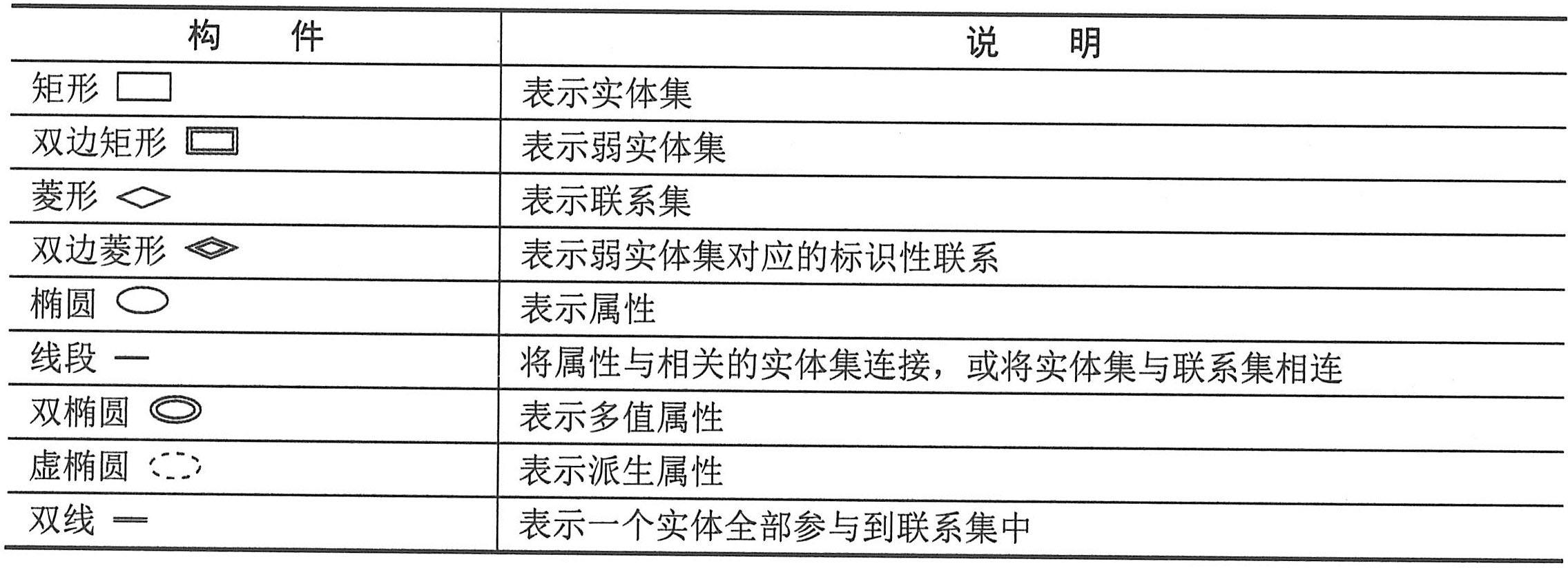 概念模型中最常用的方法为实体-联系方法,简称E-R方法。该方法直接从现实世界中抽象出实体和实体间的联系,然后用非常直观的E-R图来表示数据模型。在E-R图中有下表所示的几个主要构件。