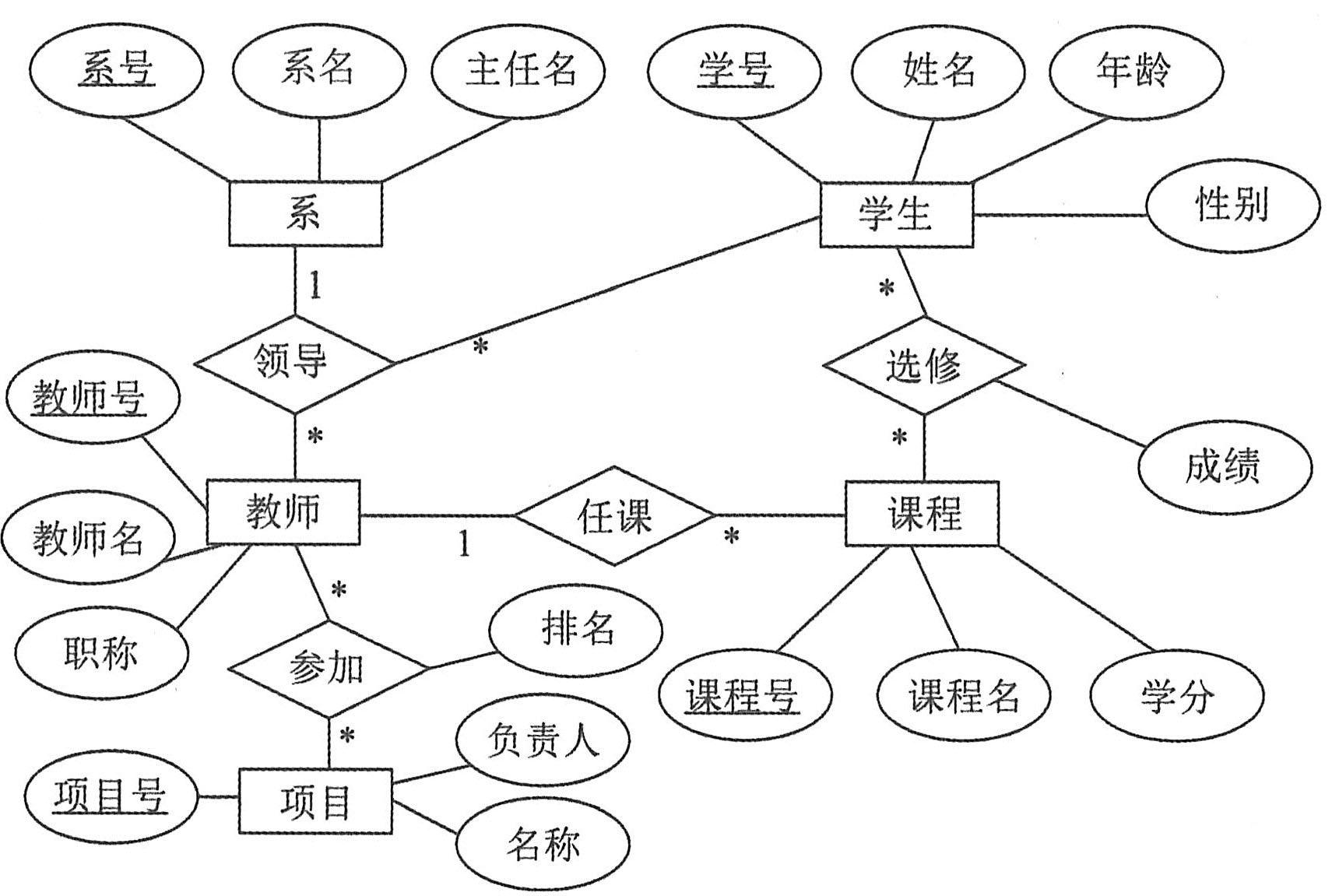 部门、员工和项目的关系模式及它们之间的E-R图如下所示,其中,关系模式中带实下划线的属性表示主键属性。