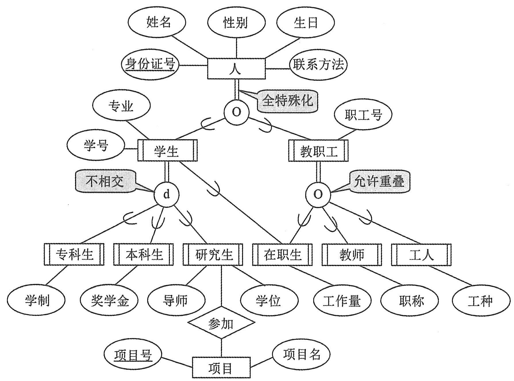 在扩充的E-R模型中,子类继承超类的所有属性和联系,但是,子类还有自己特殊的属性和联系。超类-子类关系模型使用特殊化圆圈和连线的一般方式来表示。超类到圆圈有一条连线,连线为双线表示全特殊化,连线为单线表示部分特殊化;双竖边矩形框表示子类;有符号“∪”的线表示特殊化;圆圈中的d表示不相交特殊化;圆圈中的o表示重叠特殊化。