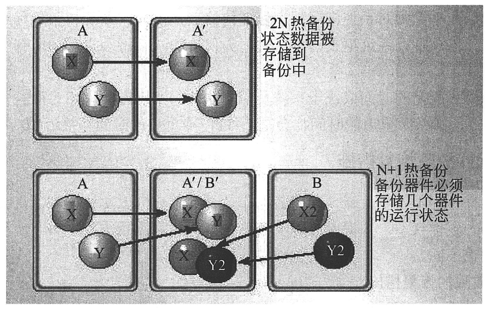 热重启系统中同样需要在故障管理事件之前预先指定备份部件。这在2N系统中最为明显,因为该系统的部件与备份部件是一一对应的(见下图)。而在N+1系统中,热重启要求备份部件保存多个运行中部件的状态信息,因此备份部件就必须具有额外存储能力,否则就必须采用暖重启模式。
