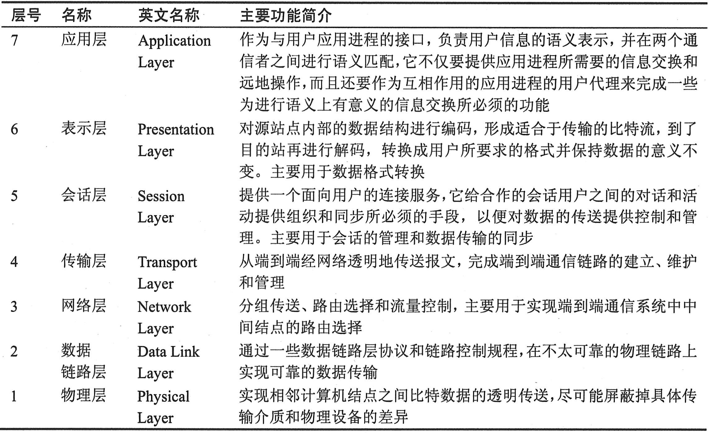 在OSI中采用了三级抽象:参考模型(即体系结构)、服务定义和协议规范(即协议规格说明),自上而下逐步求精。OSI/RM并不是一般的工业标准,而是一个为制定标准用的概念性框架。经过各国专家的反复研究,在OSI/RM中,采用了如下表所示的七个层次的体系结构。