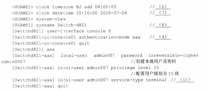 下面是对交换机进行基本信息配置和认证信息配置的代码,请为下面的配置代码选择正确的注释。