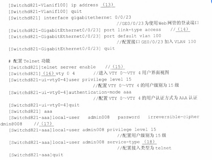 下面是对交换机进行管理信息及远程Telnet功能的配置代码,请选择正确的代码或注释。