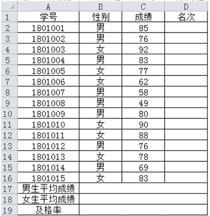 在Excel的Sheet1工作表的A1:D19单元格内创建如下图所示学生成绩表。按题目要求完成后,用Excel的保存功能直接存盘。(表格没有创建在指定区域将不得分)。