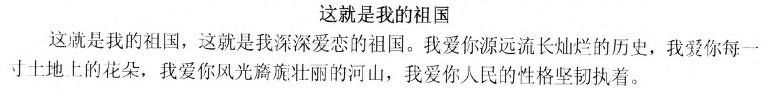 3.在正文第一自然段后另起行录入第二段文字:我的祖国,我深深爱恋的祖国。你是昂首高吭的雄鸡,唤醒拂晓的沉默,你是冲天腾飞的巨龙--叱咤时代的风云,你是威风凛凛的雄狮——舞动神州的雄风,你是人类智慧的起源——点燃文明的星火。