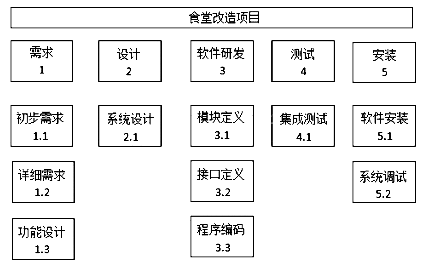 (2)交付成果如果规模较小可在②小时完成,或逻辑上不能再分,或所需请帮助资源、时间、成本可估算可控制的特征,那么它就可能被当作③。③的编码设计与①存在对应关系、其每一层代表编码的某一位数,有一个分配给它特定的代码数字。