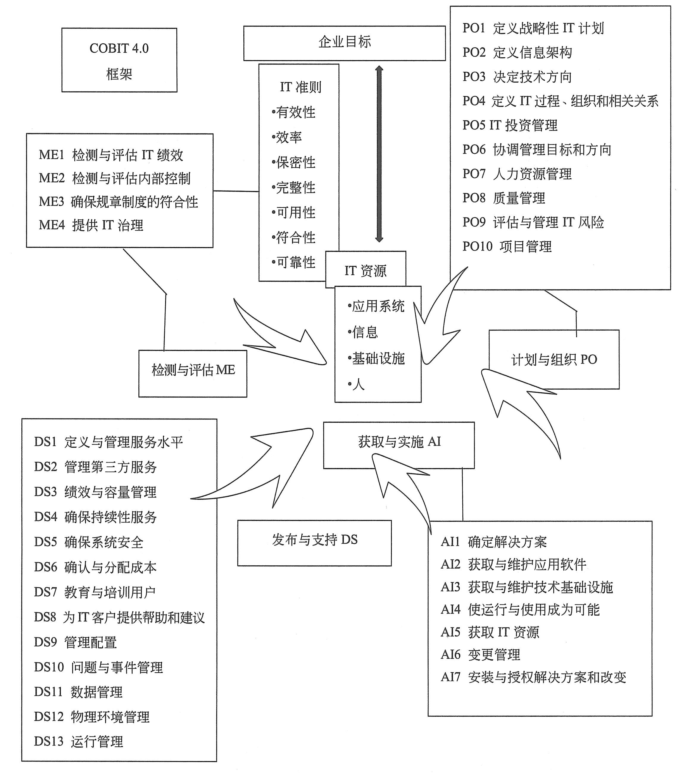 信息系统和技术控制目标(Control Objectives for Information and Related Technology,COBIT)目前已成为国际上公认的IT管理与控制标准。该标准为IT治理、安全与控制提供了一个一般适用的公认框架,以辅助管理层进行IT治理。COBIT是基于已有的许多架构建立的,如SEI(Software Engineering Institute)的能力成熟度模型(Capability Maturity Model,CMM)对软件组织成熟度五级的划分,以及ISO9000等标准。COBIT在总结这些标准的基础上重点关注组织需要什么,而不是组织需要如何做。它不包括具体的实施指南和实施步骤,它是一个控制架构,而非具体过程架构。