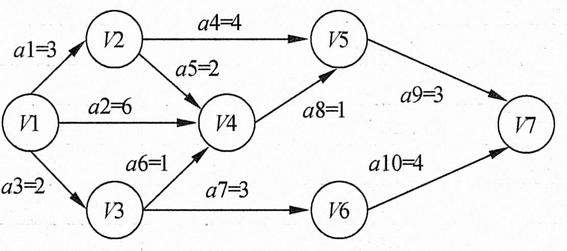 在AOV网络中,如果边上的权表示完成该活动所需的时间,则称这样的AOV为AOE网络。例如,下图所示为一个具有10个活动某个工程的AOE网络。图中有7个结点,分别表示事件1~7,其中1表示工程开始状态,7表示工程结束状态,边上的权表示完成该活动所需的时间。