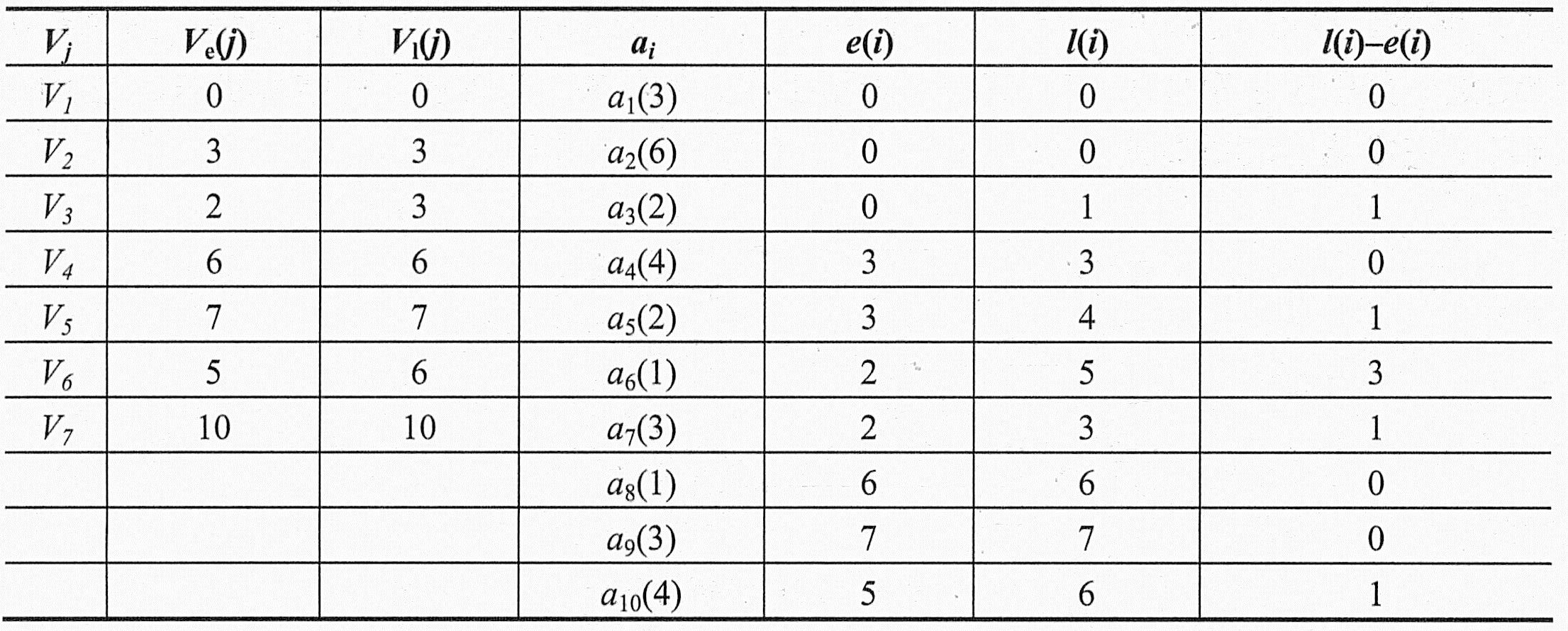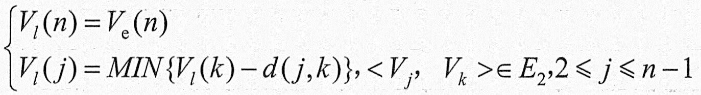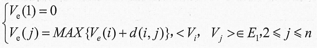 从源点Vl到某结点Vj的最长路径长度,称为事件Vj的最早发生时间,记作Ve(j)。Ve(j)也是以Vj为起点的出边<VjVk>所表示的活动ai的最早开始时间e(i)。