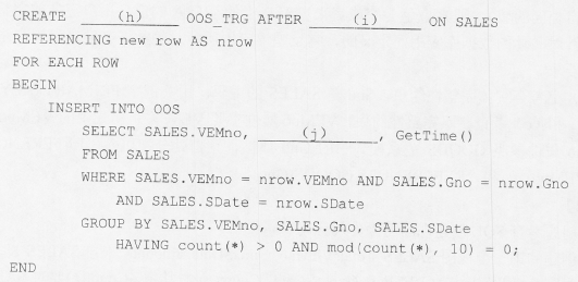 (2)每售出一件商品,就自动向销售单中添加一条销售记录。如果一天内某个售货机上某种商品的销售记录达到10条,则表明该售货机上该商品已售完,需要通知系统立即补货,通过自动向缺货单中添加一条缺货记录来实现。
