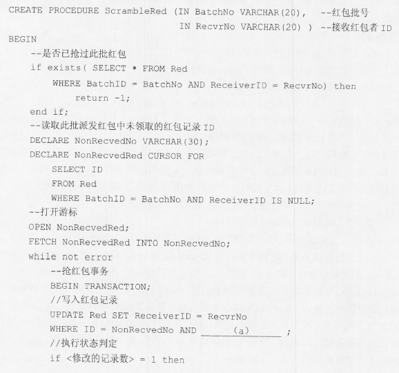 下面是用SQL实现的抢红包程序的一部分,请补全空缺处的代码。