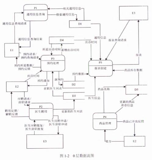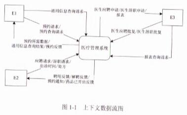 现采用结构化方法医疗管理系统进行分析与设计,获得如图1-1所示的上下文数据流和图1-2所示的0层数据流